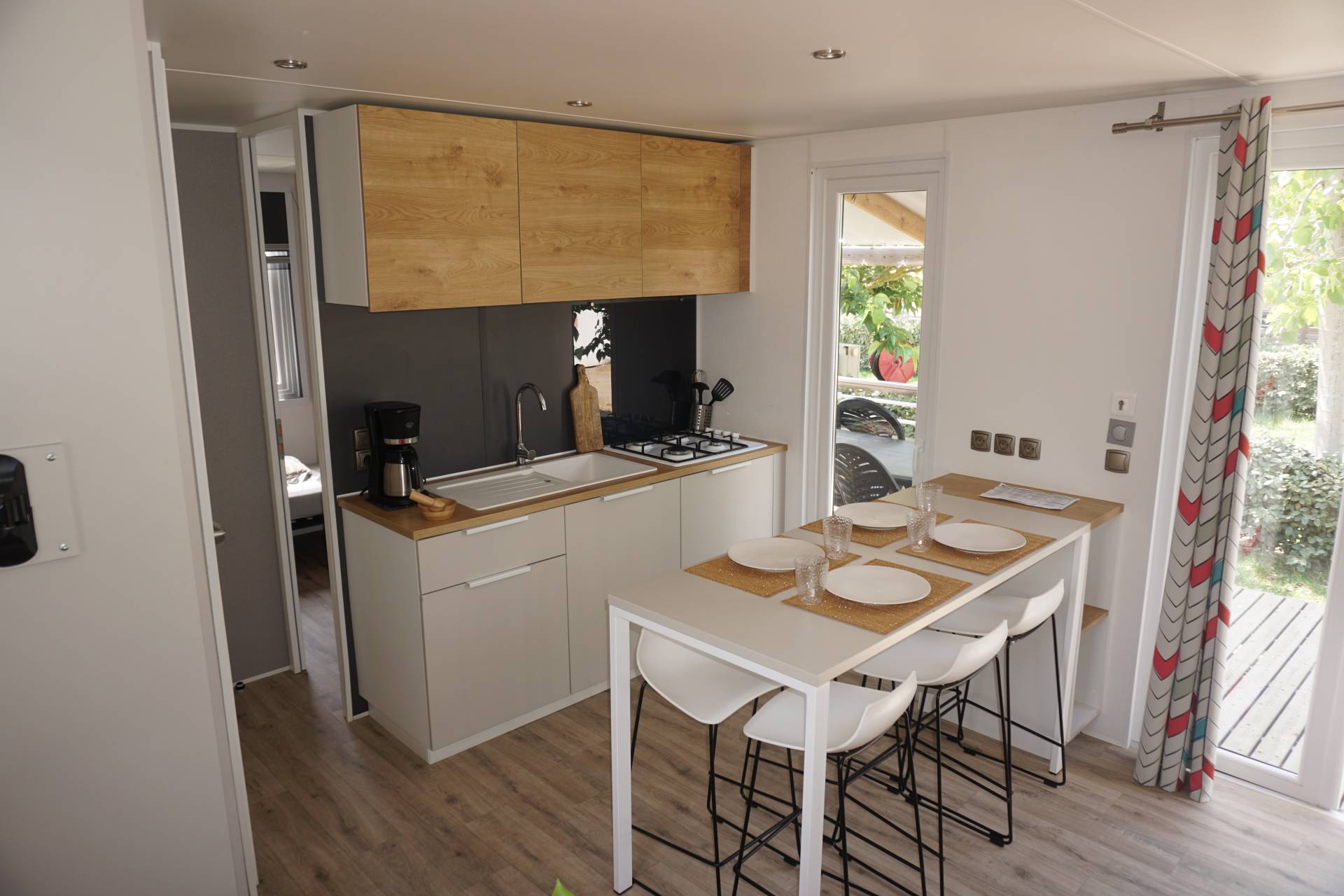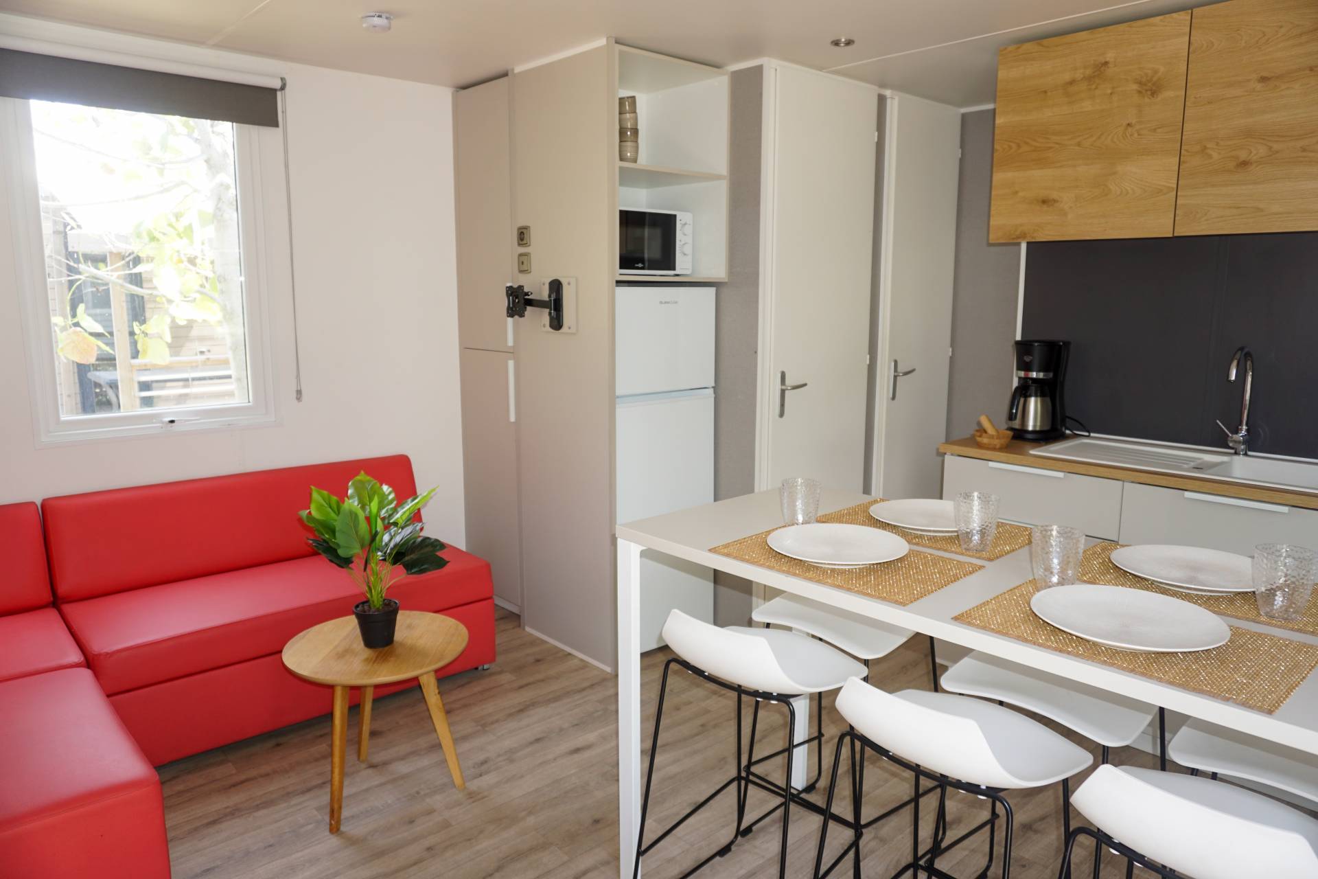 Equipement(s) en + : terrasse haute en bois + salon de jardin + parasol + banquette convertible + micro ondes + air fryer + machine à café + extincteur +