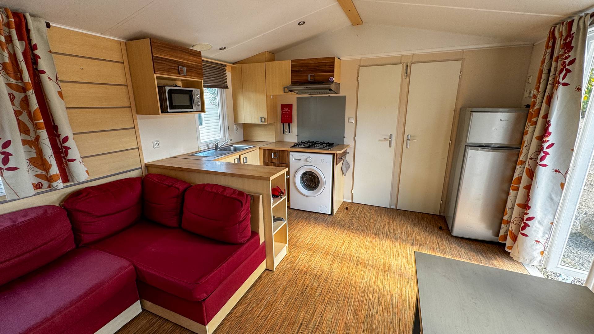 Son intérieur bien pensé comprend une pièce à vivre centrale avec cuisine ouverte équipée, une chambre principale avec lit double, deux autres chambres pouvant accueillir les enfants ou les invités, une salle d’eau avec cabine de douche et rangements intégrés, ainsi qu’un wc séparé. Le point fort de ce mobil home ? Sa luminosité qui renforce son côté convivial.