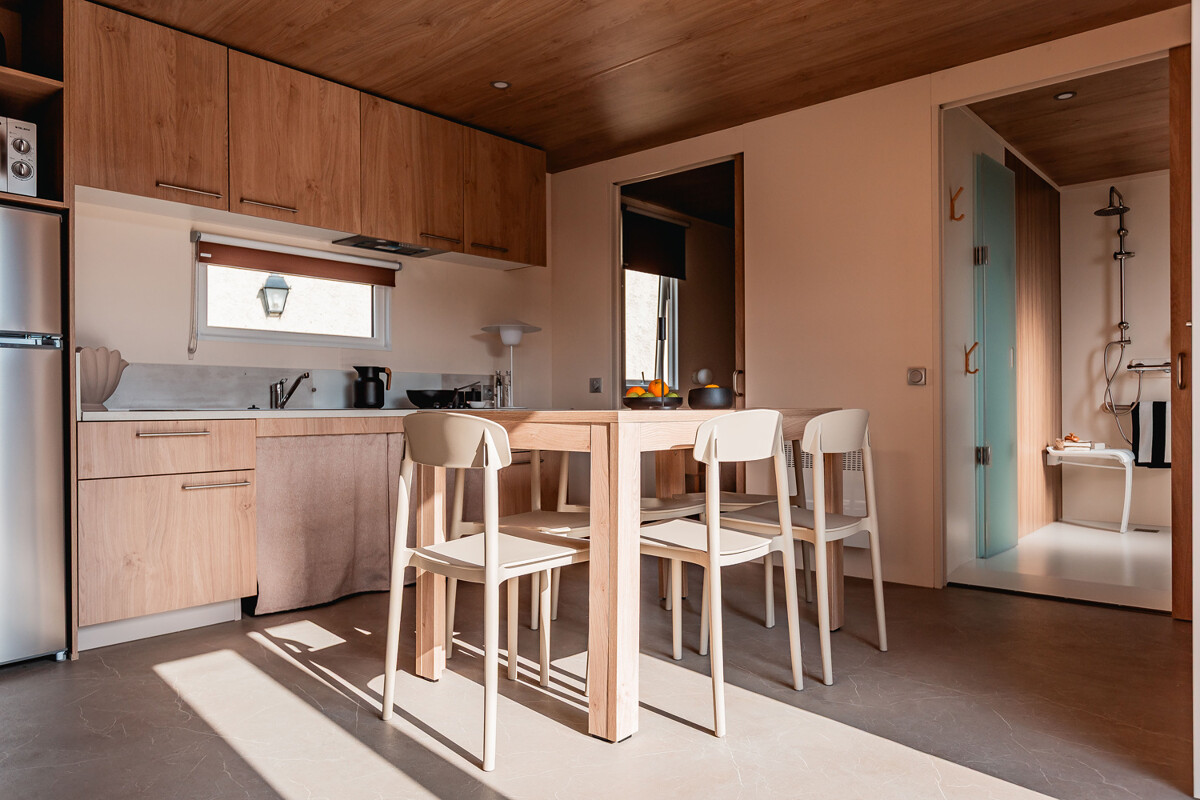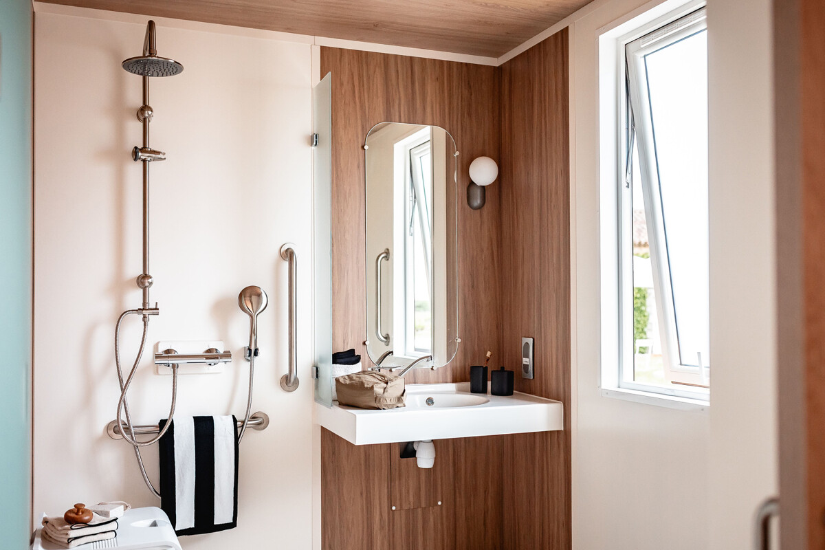 Ce mobil home de 50m² se compose d’une pièce de vie XXL ouverte sur l’extérieur grâce à ses deux baies vitrées ouvrantes, d’une cuisine avec espace repas, d’une salle d’eau spécifiquement conçue pour l’accueil des personnes à mobilité réduite, et de 3 chambres, dont une de 13m².